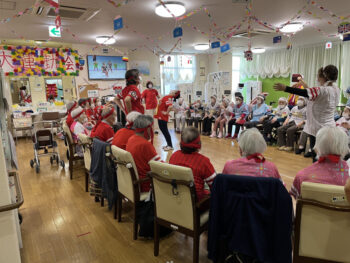 運動会 2025-10-17 | カテゴリ: ブログ | 今日は、昨日の雨とうってかわって秋晴れの良い天気になりました。 花デイサービスでは、赤組・白組に分かれて運動会が行われています。 準備体操の様子・今日のお昼ご飯は運動会メニューです。 < マイナンバーカード ミニスカートの日 >